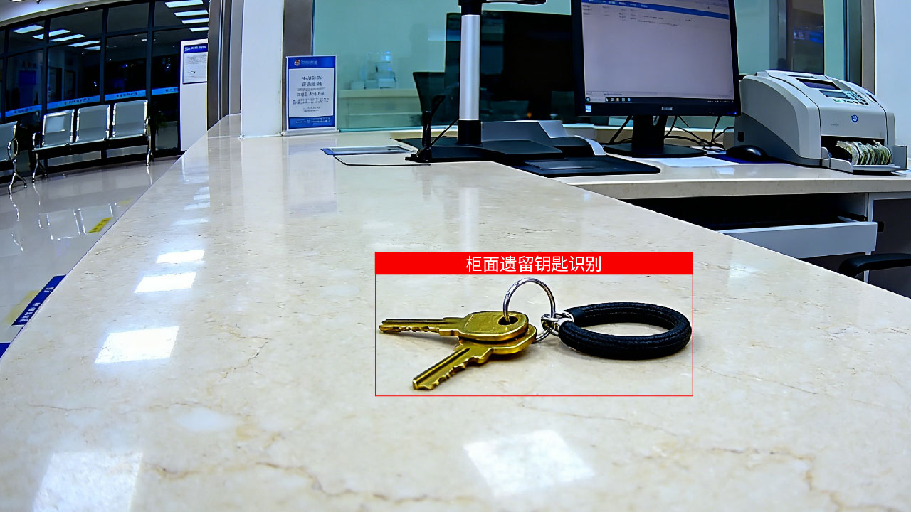 结合离岗行为与物品识别,当识别到柜员离柜后,检测柜面是否存在遗留的钥匙,若存在则报警。