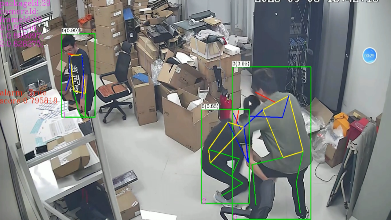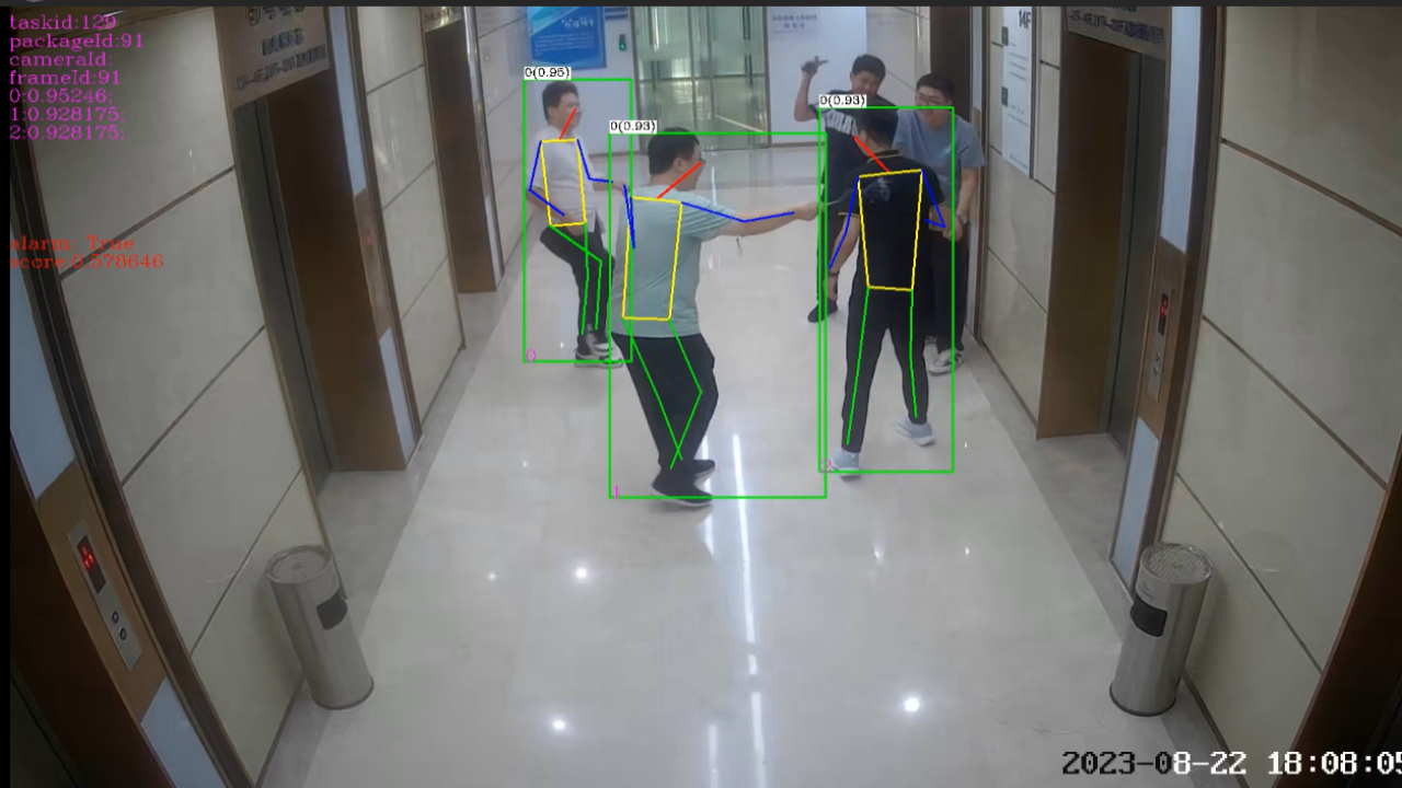 打架行为识别算法是基于深度学习的智能视频分析技术,采用多帧累积判断机制,当检测区域出现多人(≥2人)时,系统会连续分析8帧图像,综合判断人员距离、肢体动作等特征,确认打架行为后立即触发报警,有效提升安全管理效率。