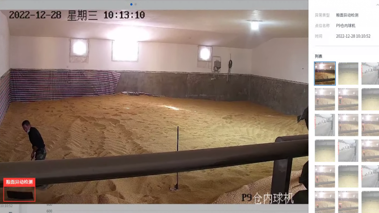 粮面异动检测是指对视频画面中的粮面进行异动(粮食堆积状态和凹陷两种状态)检测,检测到这种状态则输出告警信息。