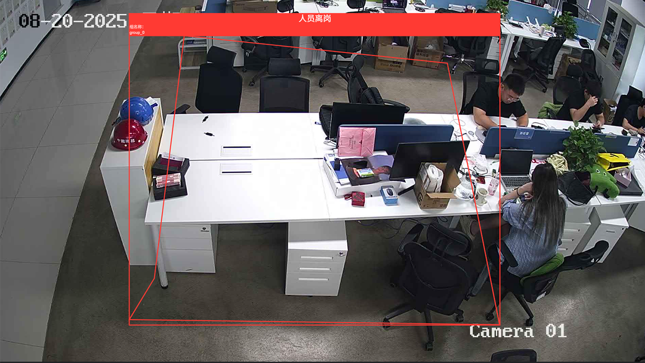 离岗识别算法基于深度学习神经网络算法,自动识别人员是否在工位或作业区域内,若不在则立即报警,离岗时间判断阈值可配置,算法鲁棒性强。
