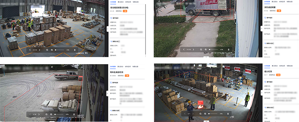 基于鲲云科技 AI 视频分析技术,中通服在多省仓储节点实现了对物料存储区域的全方位安全监控。平台集成了安全帽识别、吸烟识别、通道占用预警、烟火识别等多类算法,构建起从人员行为到环境安全的立体化防护体系。
