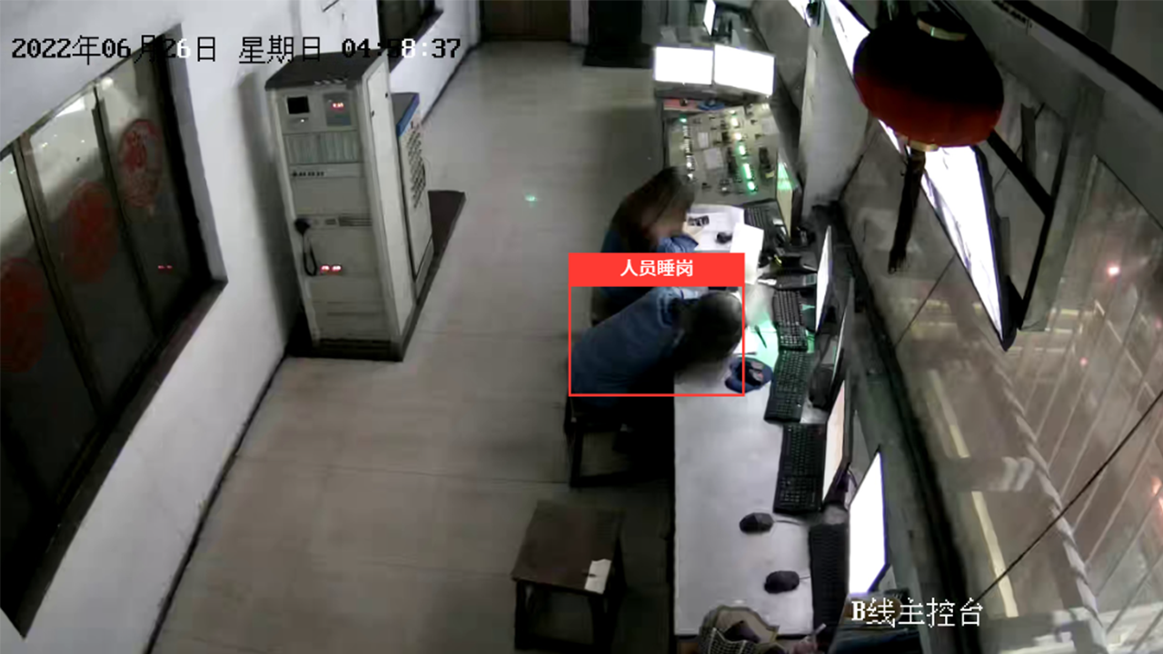 Sleep-during-duty recognition algorithm can automatically monitor whether a person in the area is sleeping, if it detects a person is sleeping, it will immediately give alarm. The judgment threshold for sleep-during-duty time can be configured. and the algorithm accuracy rate is more than 95%.