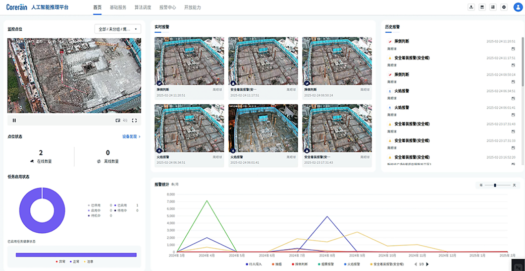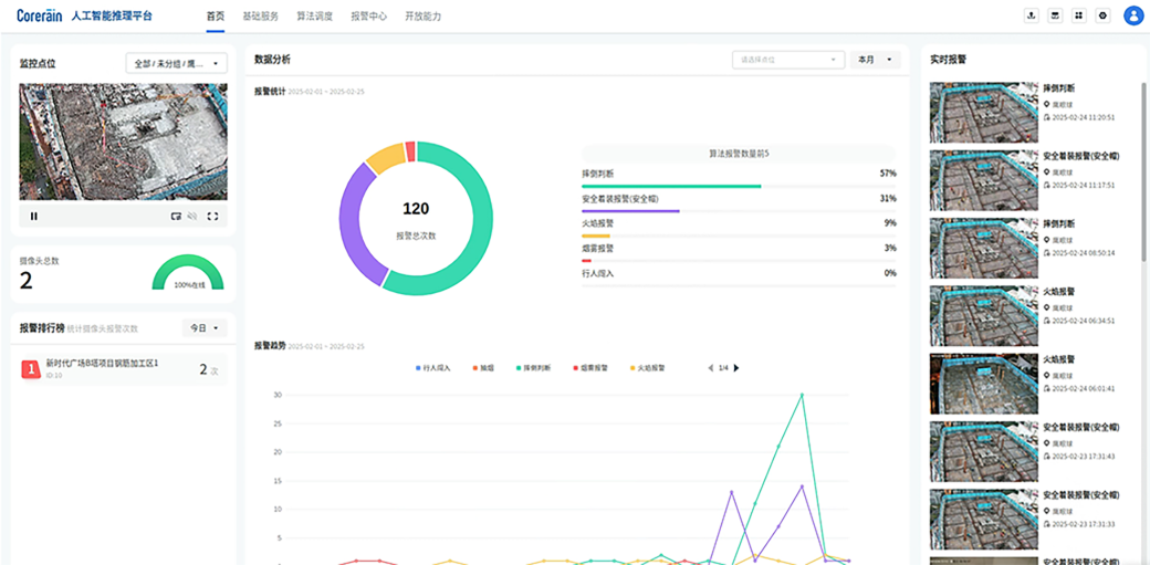 Corerain provided an intelligent safety supervision solution for over 10 of this group's construction projects in Jinan, achieving comprehensive real-time monitoring and intelligent analysis of the construction sites. Corerain supplies construction site scenario algorithms, including open flame detection, smoke detection, unauthorized vehicle parking identification, intrusion area identification, unauthorized absence detection, safety helmet absence detection, fall detection, exposed soil detection, and material stacking compliance detection.It provides real-time alerts for hazardous on-site behaviors and issues on-site warnings via loudspeakers to enable timely intervention.